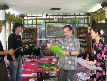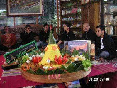 Yogyakarta– Malay soft music drifted across the hall of the Center for Research and Development of Malay culture since the morning, cone–shaped yellow rice and other beautifully prepared dishes were put in the middle of hall. All of which were to mark the first anniversary of MelayuOnline.com which felt on Sunday January 20th, 2008. At 9 a.m. all crew gathered in the hall to take part in the memorable moment. This first celebration was held in simple but still carried fully significant values. Unlike other celebrations of big mass media held lavishly, the historic moment was used as a means for self-introspection, correction, and expression of better future. The head of the Center, Mahyudin Al Mudra, S.h., M.M. commenced the celebration by cutting the top side of yellow rice as a symbol of thankfulness.