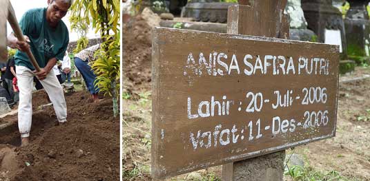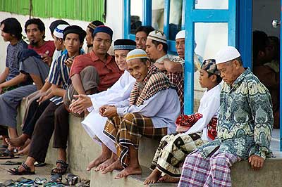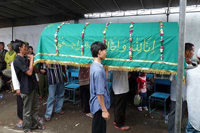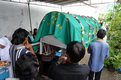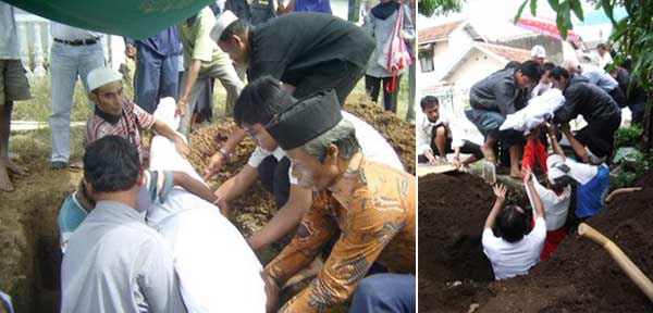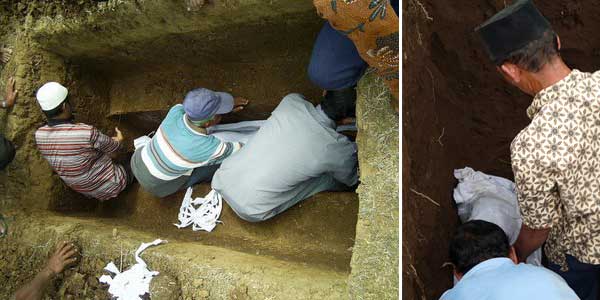 - Avant de couvrir le visage du corps, un religieux écrit avec son doigt la phrase « lâ ilâha illa-llâh » sur le sourcil de la personne morte. D‘après Daud, en citant le livre Kitab Perukunan Abdurrahman, dit que cette phrase sert à marquer lors du jour du jugement dernier si le mort est bien le fidèle de Mahomet (1997 : 294).