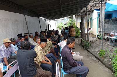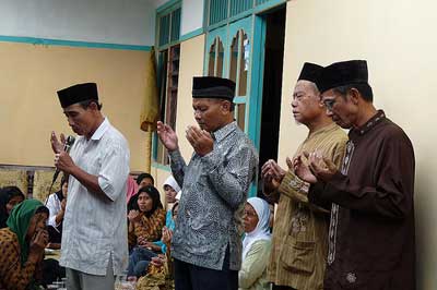 - La prière funéraire peut débuter lorsque la dépouille mortelle dont la tête s‘oriente vers le nord est posée sur un siège allongé. Comme la prière funéraire doit être faite en commun, elle est dirigée d‘un imam et suivie par au minimum 40 makmum fidèles. Le nombre de fidèles désigne la croyance des Banjar disant que Dieu exaucera au moins une prière des 40 fidèles. Par conséquent, si le nombre de fidèle n‘atteint pas 40 personnes, la famille du mort cherche plus d‘hommes pour remplir la condition requise. Elle invite souvent les habitants de la communauté en leur donnant une telle somme de l‘argent à l‘échange de leur participation.