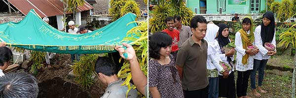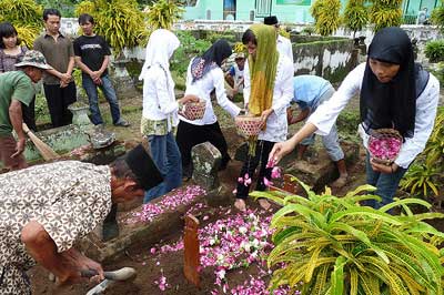 - Après la récitation de la prière de talkin, les proches du défunt arrosent les fleurs et banyu yasin ‘eau récitée de la sourate de yâ sin‘ au dessus de la tombe.
