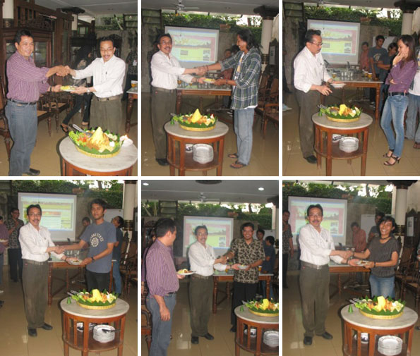 To close the occassion, accompanied by Dr. Aris, Bang Mahyudin sliced off the tumpeng and blew candles. The first slice was given to Dr. Aris Arif Mundayat, who has been helping Melayuonline.com selflessly and sincerely. Next, while congratulating Ceritarakyatnusantara.com and Maharatu Tour Agent, both have their birthday in the same date with Melayu Online’s, the second and third slices were given to Samsuni, S. Th. I, M.A., Chief Redactor of the site, and Yuhastina Sinaro, S. Par., manager of the tour agent, respectively. The last slices were handed to Elizabeth Murni, the youngest redactor, and Reza Daffi, S. S. the newest redactor of Melayuonline.com.