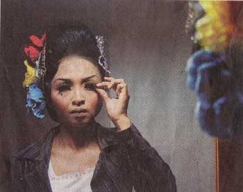 Seorang penari Zapin berdandan sebelum tampil pada FestivalSemarak Zapin Serntai di Pulau Bengkalis, Riau, awal September lalu.Dandanan Penari Zapin berubah lebih variatif, mengikuti perkembangan zaman.
