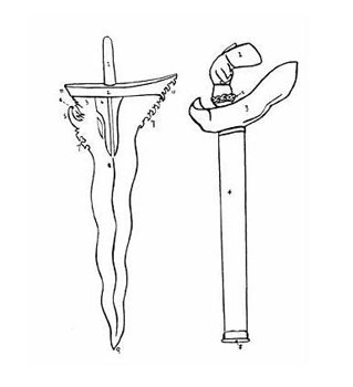 Bentuk hulu keris ini berbentuk seperti Dewa, setengah manusia, setengah burung, mungkin seekor Garuda, dalam posisi berjongkok dengan kedua tangan terlipat memegang sisi kanan dan kiri tubuhnya. Sosok itu seolah-olah sedang menggigil karena demam.