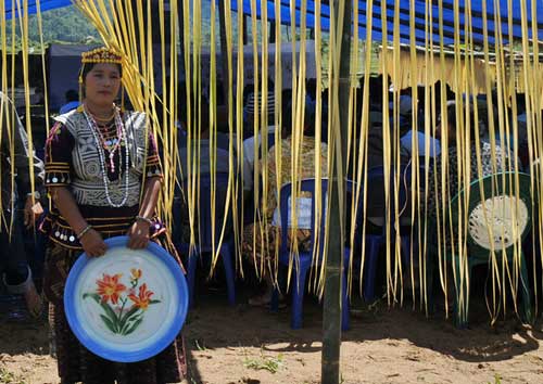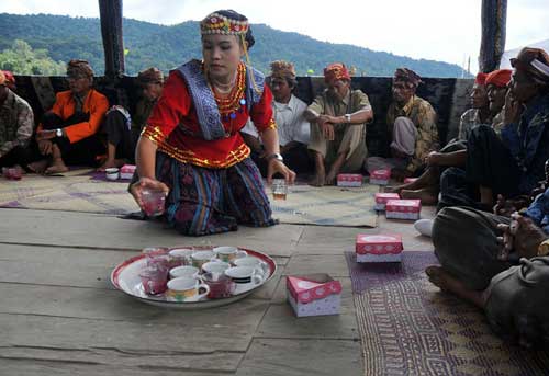 memotong-motong daging kerbau yang baru disembelih - Setelah matang, para gadis-gadis berpakaian adat menyuguhkan nasi dengan lauk daging kerbau kepada para peserta. Biasanya, hidangan pertama kali diletakkan di depan para ketua adat, baru kemudian disajikan kepada peserta yang lain.