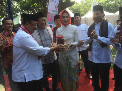 Camat Pondok Aren, Makum Sagita menyerahkan dodol kepada walikota Tangsel Airin Rachmi DIany dalam gelaran budaya lebaran betawi tangsel 2016